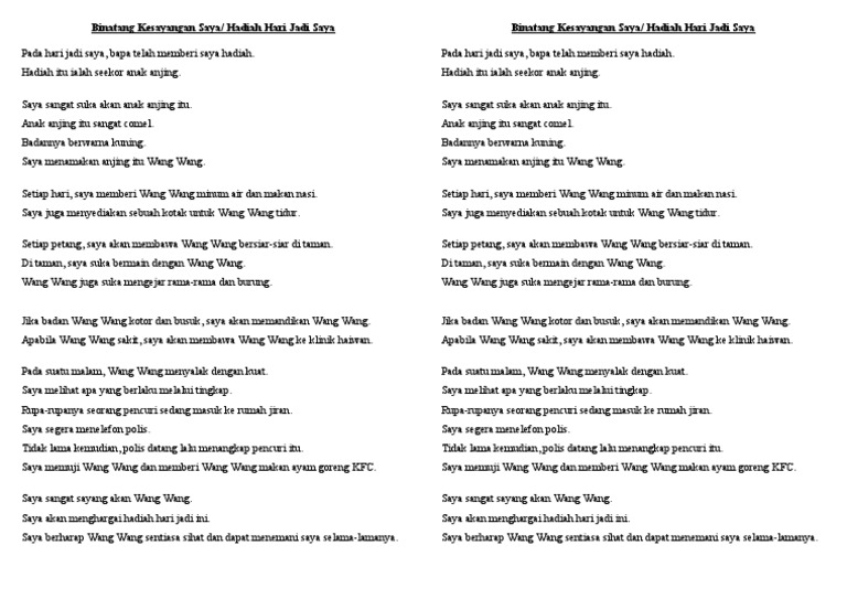 Binatang Kesayangan Saya Tahun 3 Kebanyakan orang ada memelihara binatang seperti burung ikan arnab kucing dan anjing. Aku mempunyai hewan kesayangan. Contoh Karangan Kawan Datang Melawat Saya By Da_Evangeline73 04 Jul 2022 Post a Comment Standard 2 Latihan Tatabahasa Bahasa Melayu Malay Language Grammar And Vocabulary Education 60 Contoh Karangan 10 Ayat Jenis Karangan Keperihalan Lawatan Ke Rumah Kanak Kanak Pdf Karangan Laporan Lawatan Sambil Belajar Ke Kuala Lumpur.